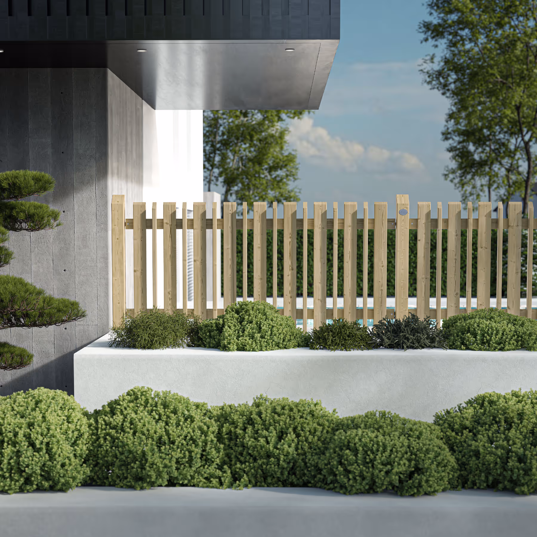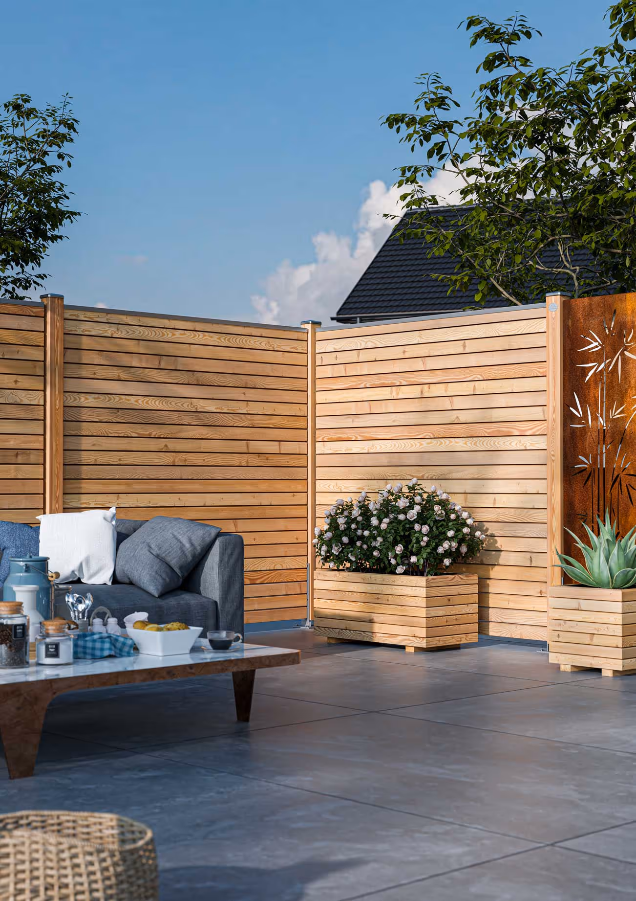 Großes Sortiment aus einer Hand: Zäune, Sichtschutzwände, Pflanztröge – alles aus Holz und perfekt aufeinander abgestimmt.